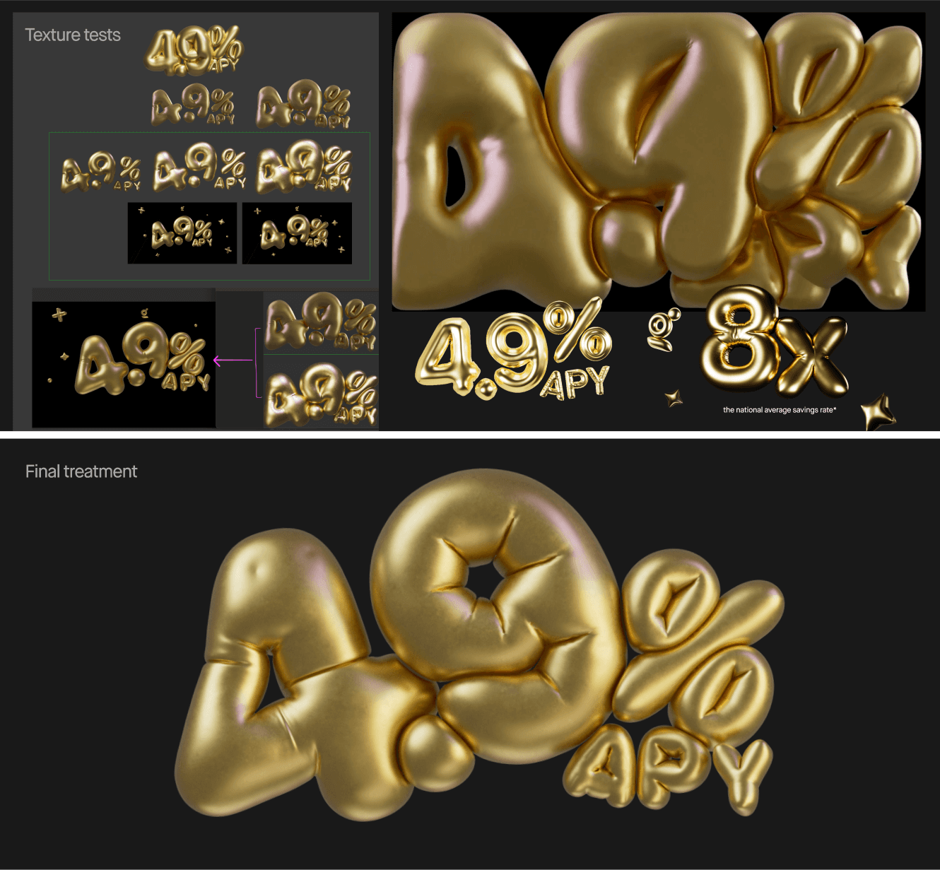 We were starting to like where some of the compositions were heading, but we were really struggling with the 3D design of the numbers themselves. We wanted the numbers to feel almost over-inflated, but they still needed to read well even at their most expanded state. We went through countless iterations on the design, structure, and inflation level of the numbers and other elements. On top of that, we also tried out a wide range of textures and finishes on the visuals. We found that a super-shiny metallic finish on the elements looked very luxe, but the high contrast in the highlights and shadows made legibility difficult. We landed on a softer mid-tone gold texture with subtle purples and pinks in the highlights. The overall look of the final elements feels larger than life, but at the same time very readable!