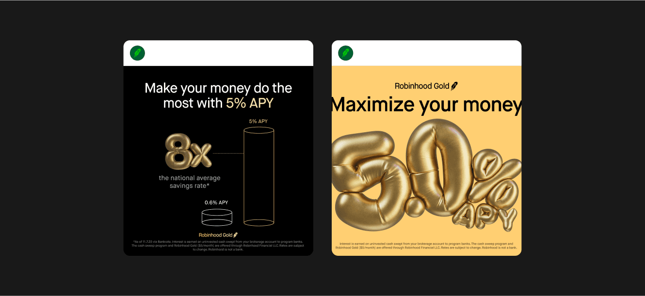 The Robinhood Gold team launched a multichannel test campaign in November of 2023. The main goals of this campaign were to amplify Gold’s cash sweep offering to the world, spread product awareness and drive sign-ups. Crucially, the campaign needed to do this in such a way that it would stand out to customers across a diverse channel mix (connected tv, podcast ads, paid social, affiliate placements, and more) AND feel natural alongside Robinhood’s core brand materials.